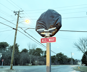 (April 3, 2026) Two additional stop signs went up at the intersection of Surfside Road, Miacomet Road and Surfside Drive Thursday, but they are still covered in black plastic, which won't be removed until Monday.